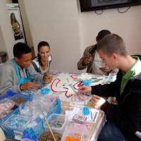 Catherine Clarke, Jill Tattersall and Leona Matuszczak. For over a week and a half in July 2010 the Artyface team of Maud, Clem Riches, Catherine and Leona worked with hundreds of pupils, helped for a week by 4 dedicated 6th-formers, and teachers, cleaners and many other visitors popped in to help and many caught the mosaic-bug! Workshops also took place with neighbouring community groups: Hopscotch Asian Women's Group, Age Concern, New Horizons and Somers Town Youth Centre. One of the panels will be going up permanantly in a public alleyway that leads to the Community Centre and the others will be going up in the school playground. The opening ceremony will be in the Autumn Term 2010. |